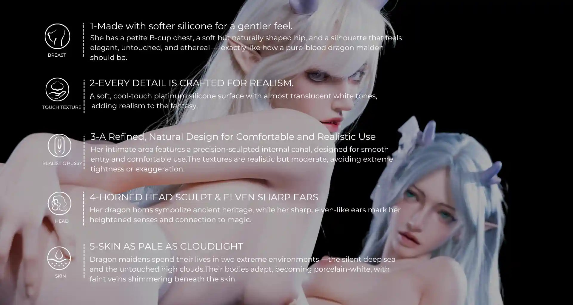 The dragon horns represent her source of power.Her petite face, slim waist, soft breasts, and rounded curves are crafted based on a perfect balance between realism and anime aesthetics.