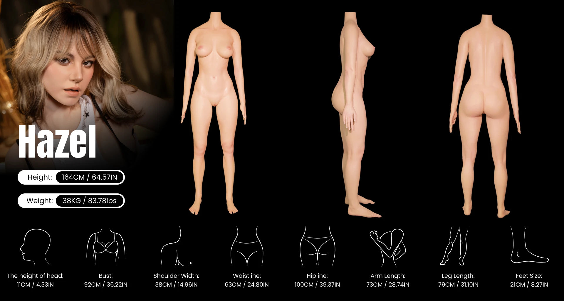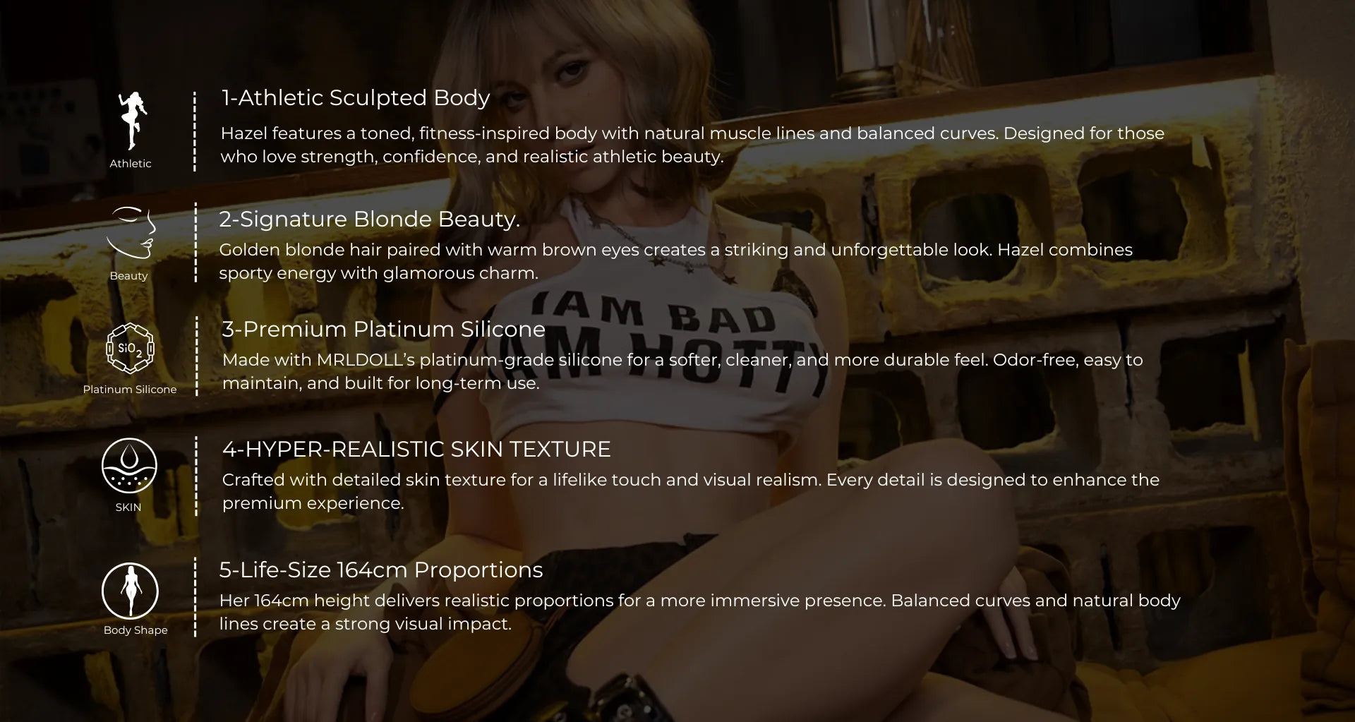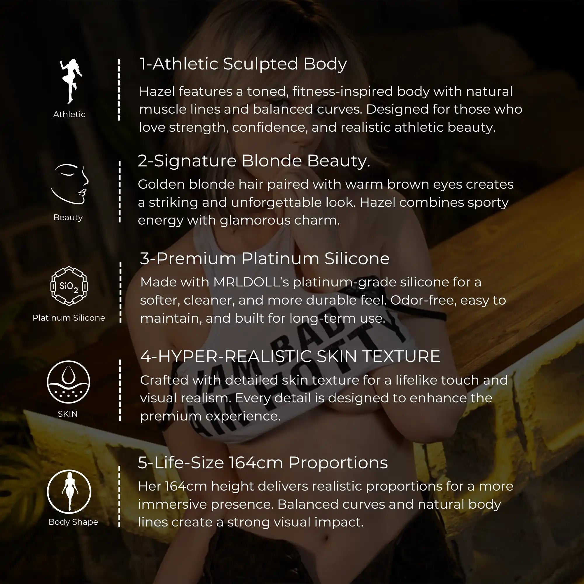Hazel is designed for those who appreciate strength, beauty, and realism in one complete form. With her athletic body shape, blonde hair, and warm brown eyes, Hazel combines a sporty aesthetic with lifelike craftsmanship. Made from premium platinum silicone, she offers a realistic touch, durable structure, and a premium long-term experience.