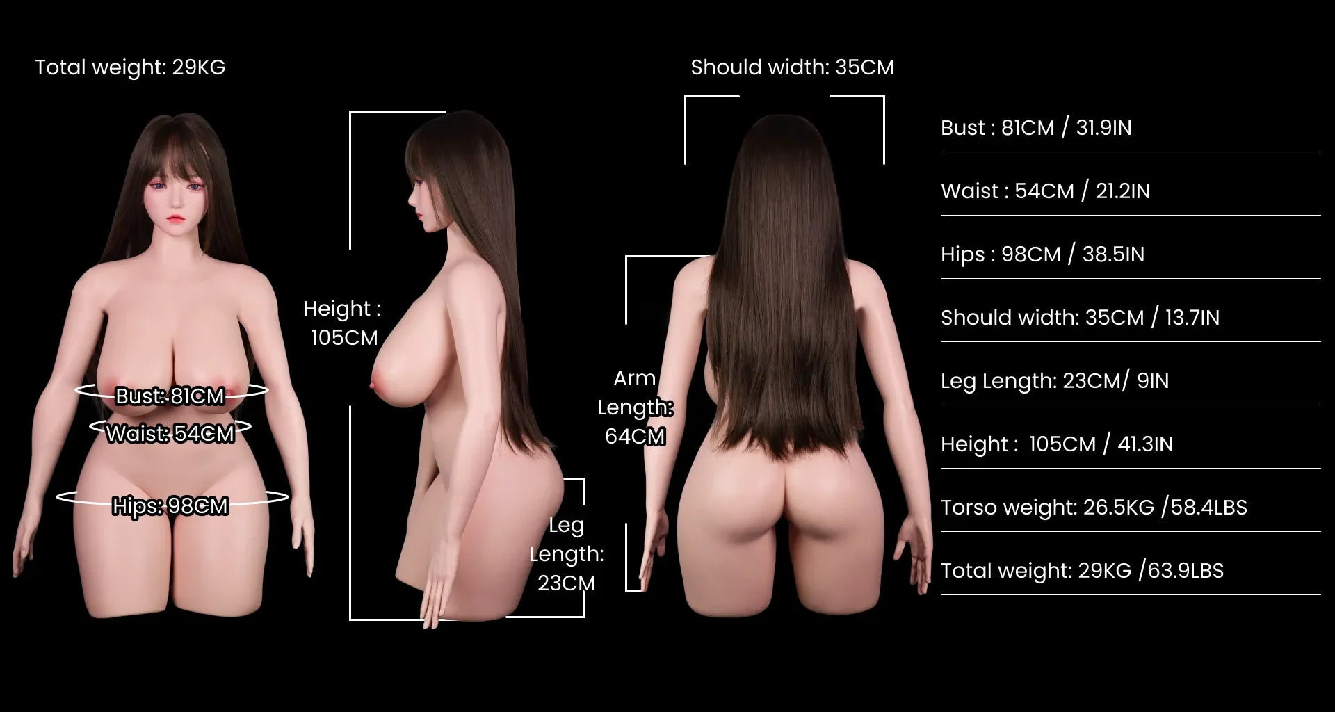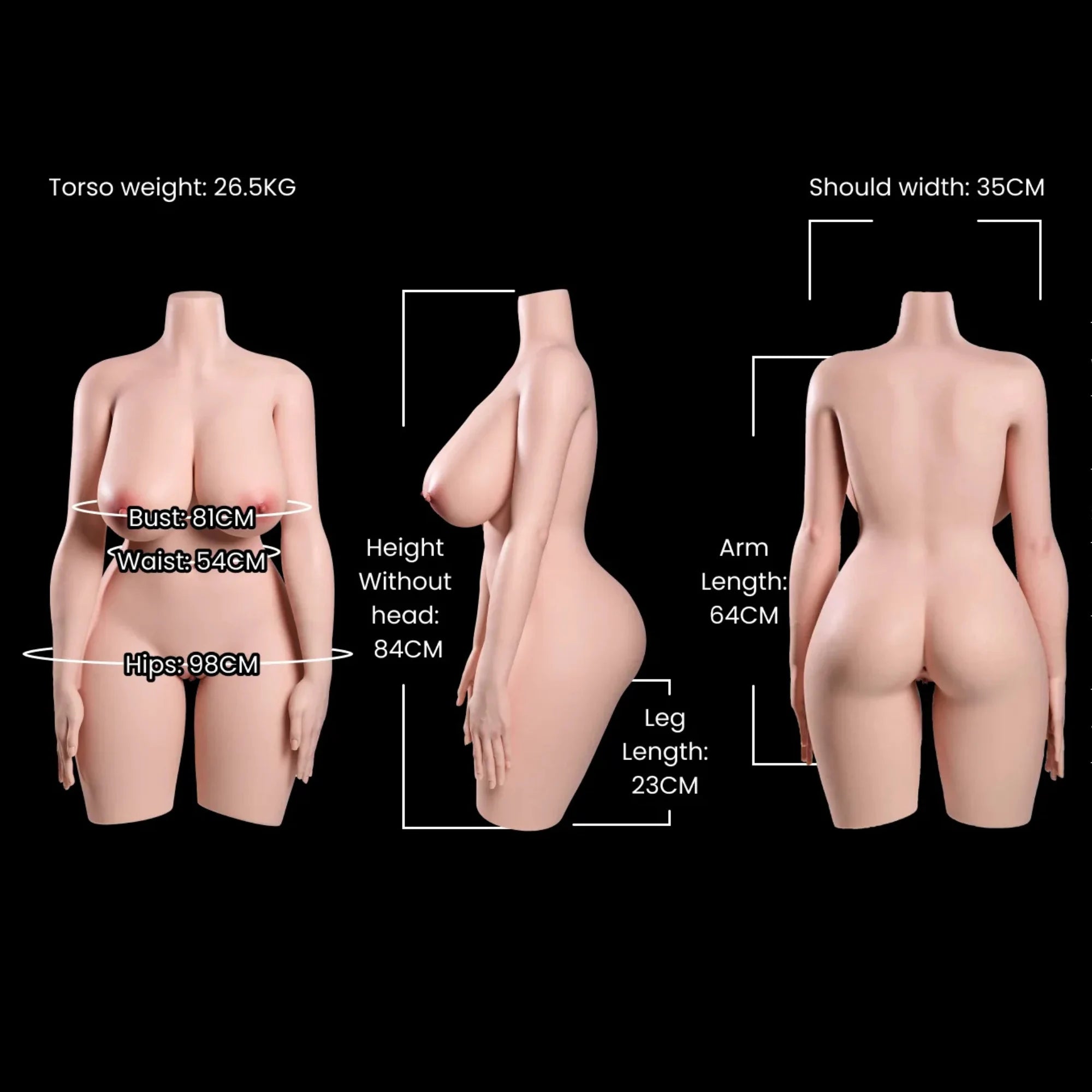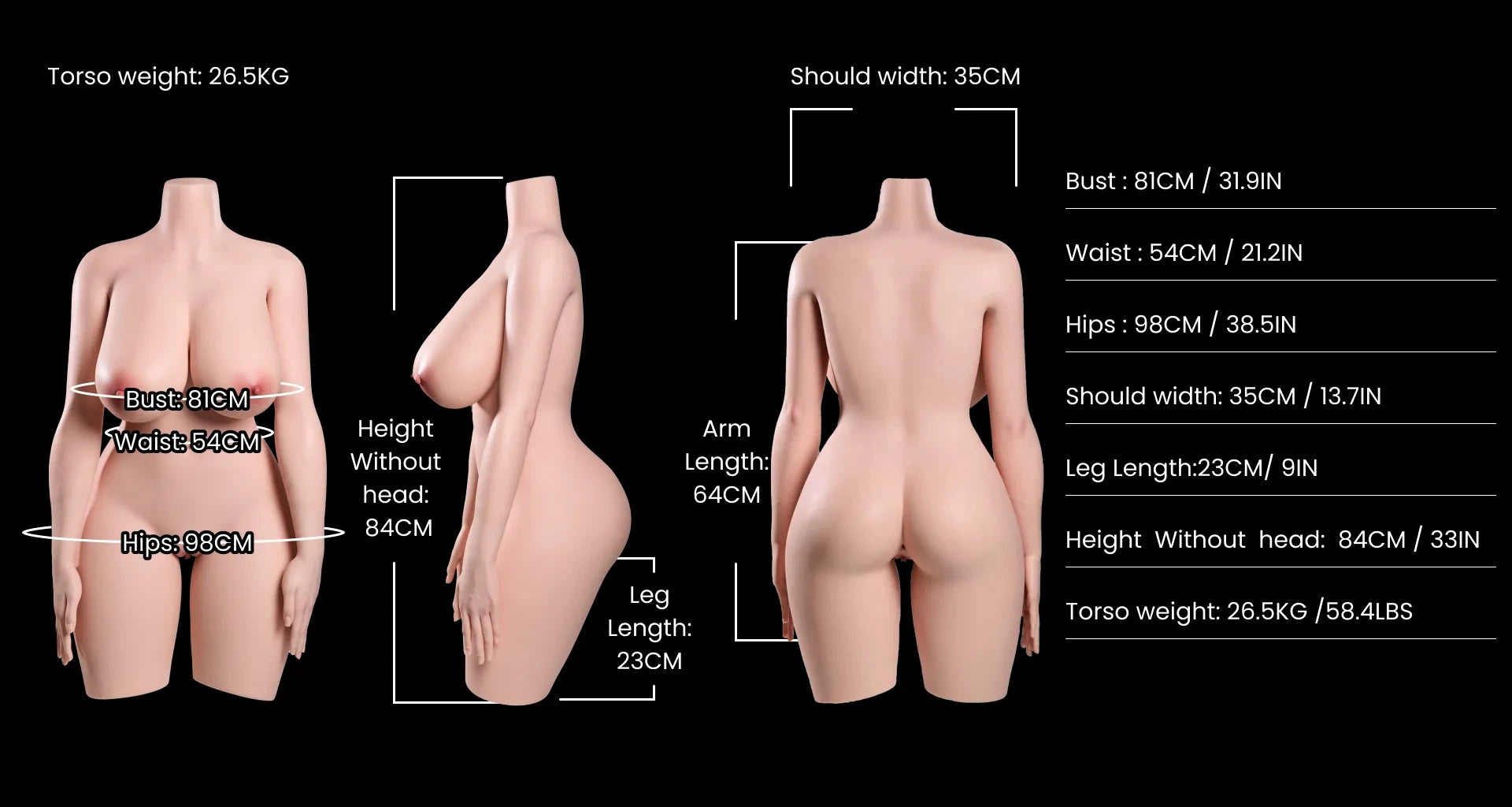 Fall in love with every curve. This realistic silicone sex doll torso, made of medical-grade silicone, features a small delicate face, soft big breasts, and a round, touchable butt.