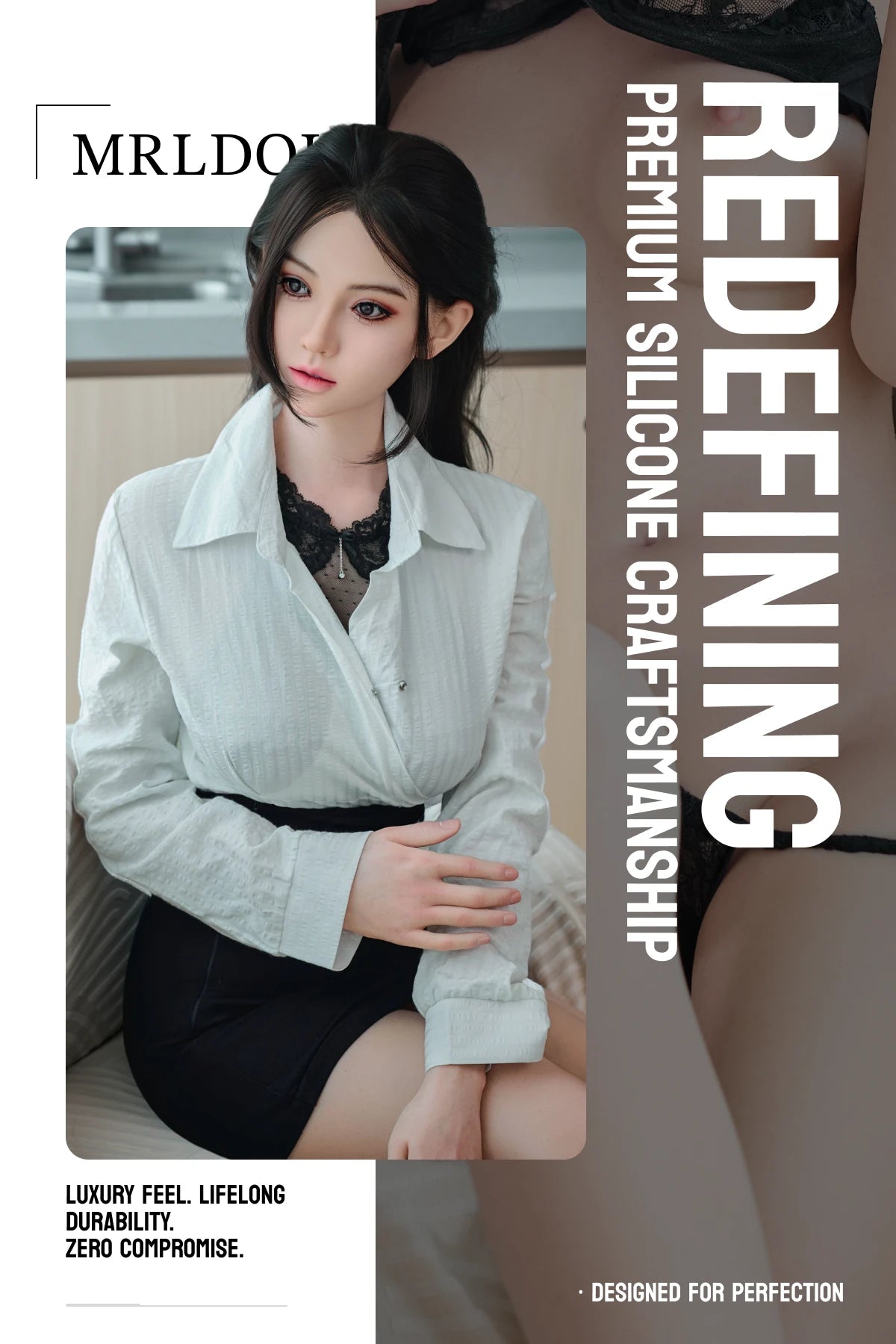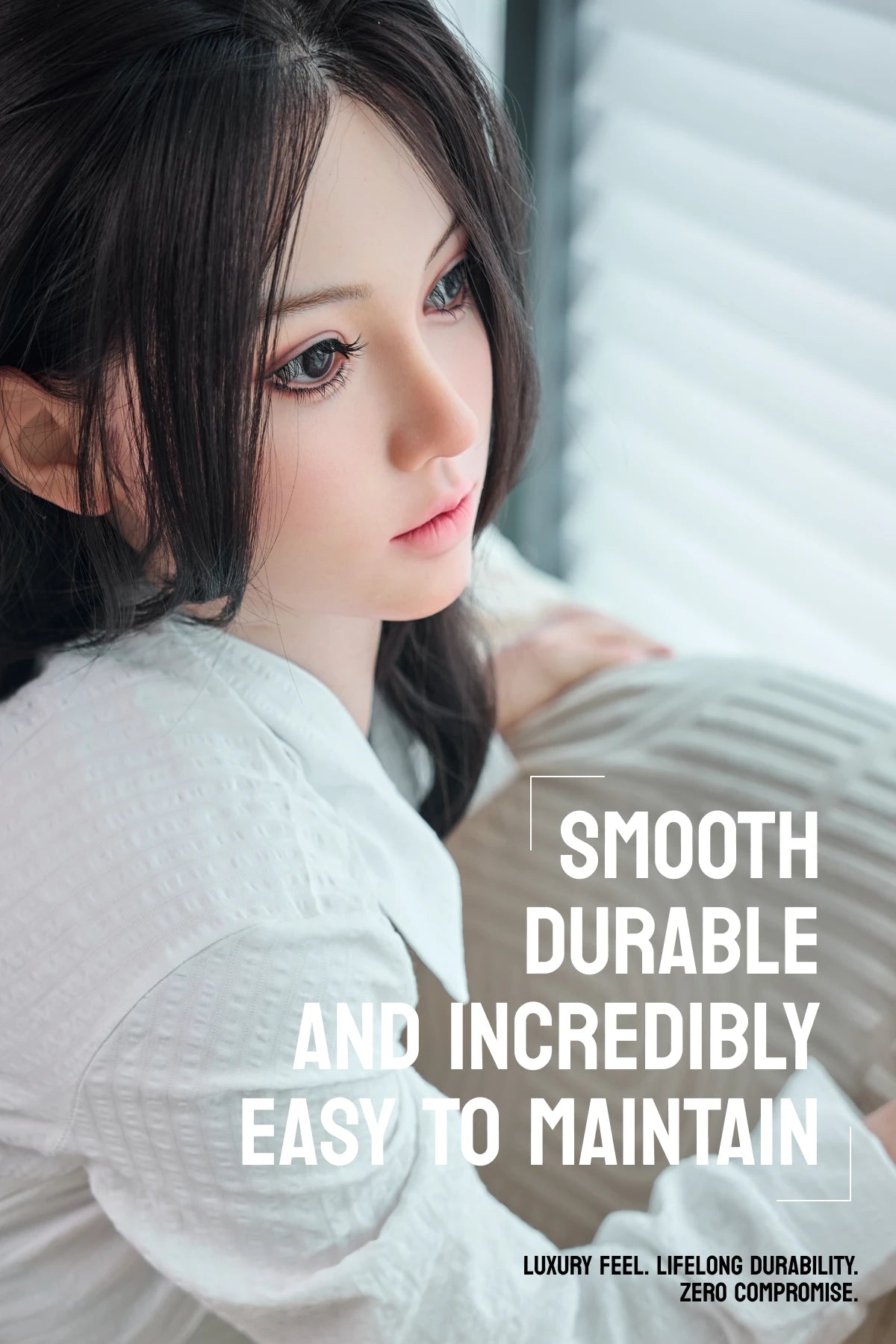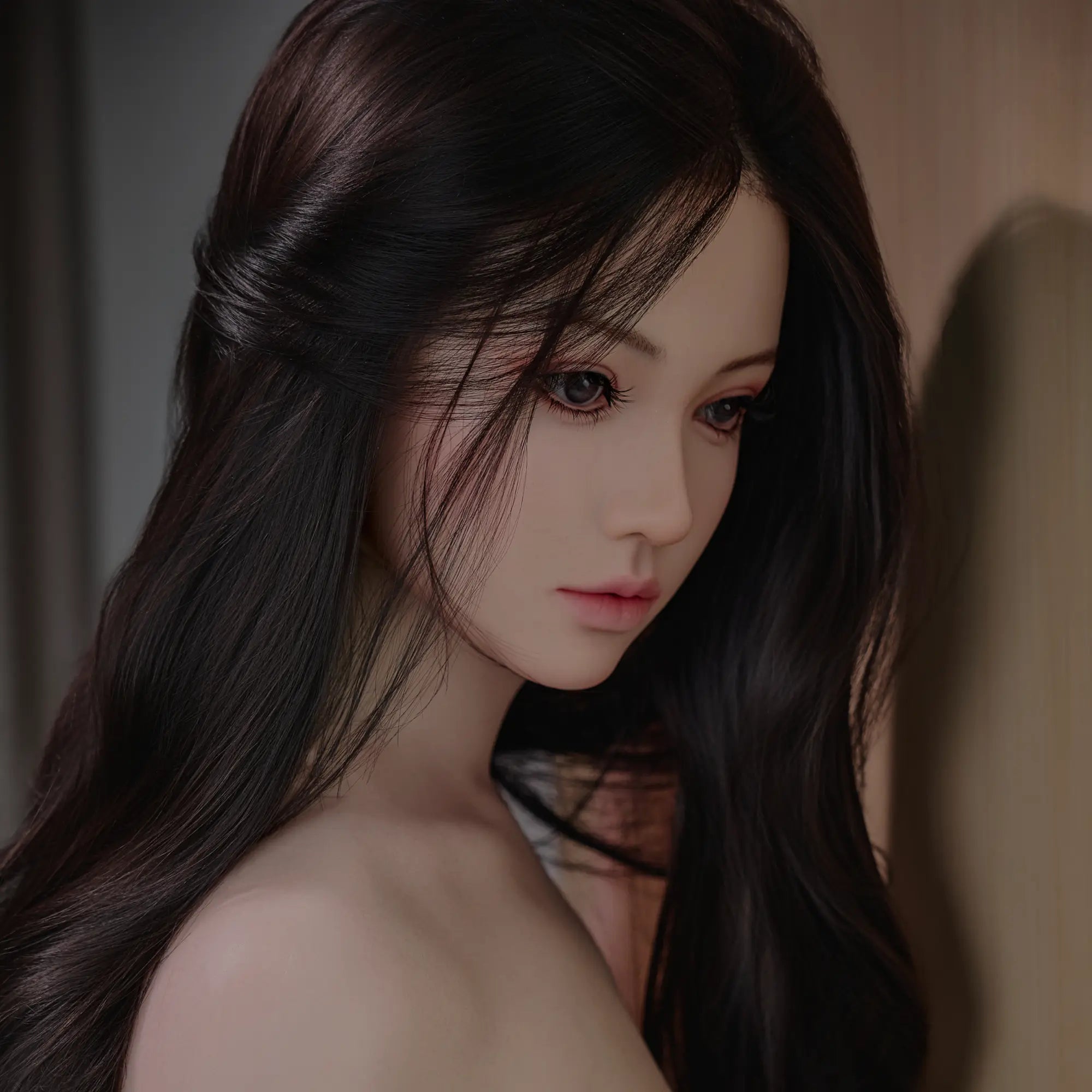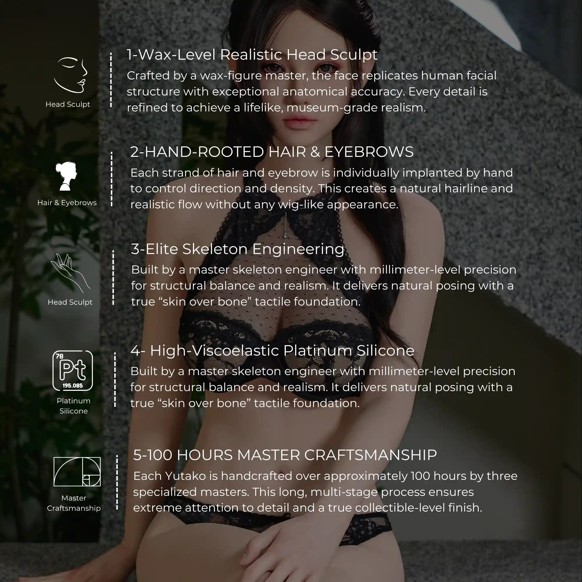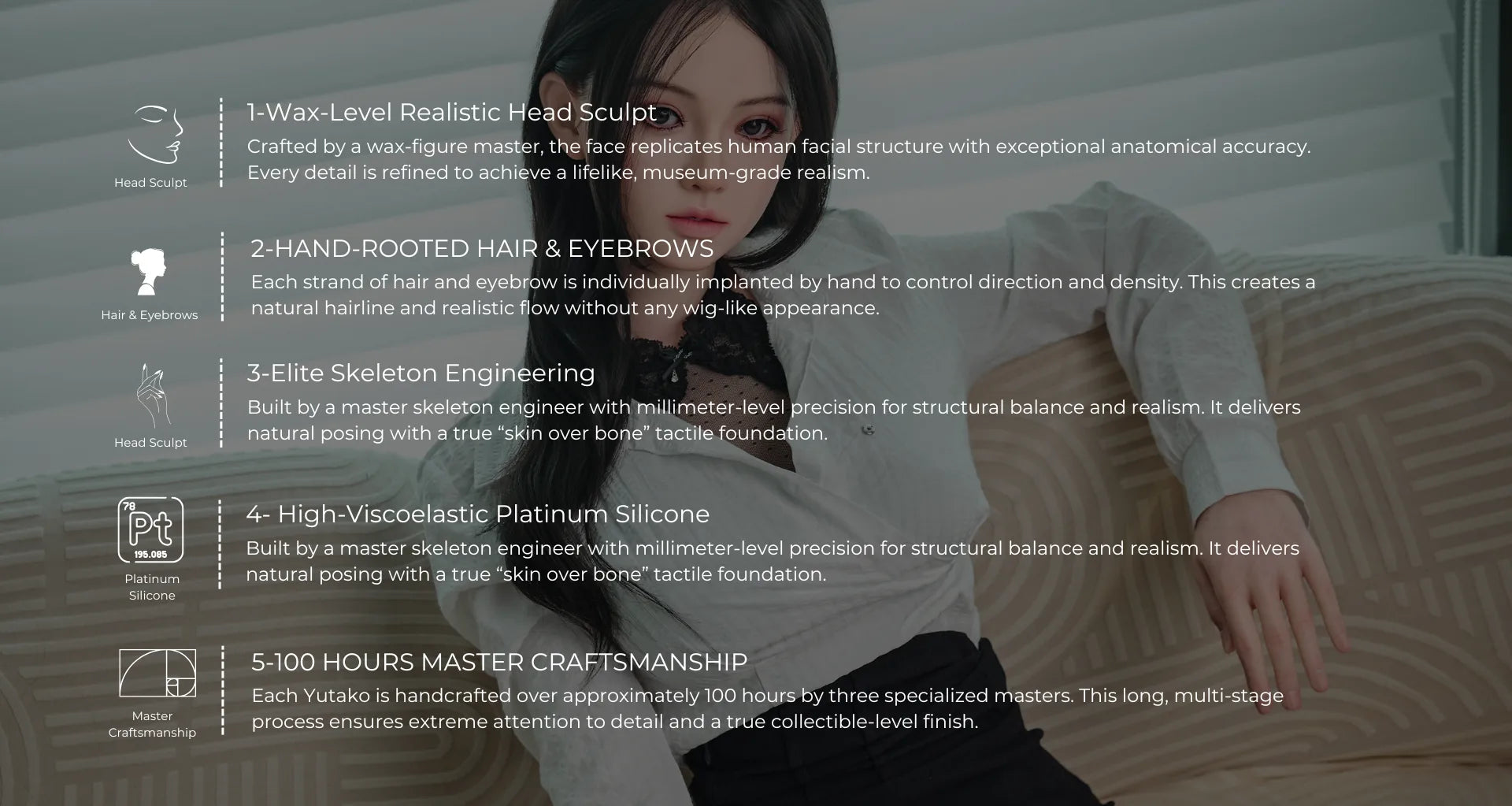 Yutako combines wax-level facial sculpting, hand-rooted hair, and high-viscoelastic platinum silicone to achieve a lifelike appearance and touch. It is designed to replicate both visual realism and physical texture.